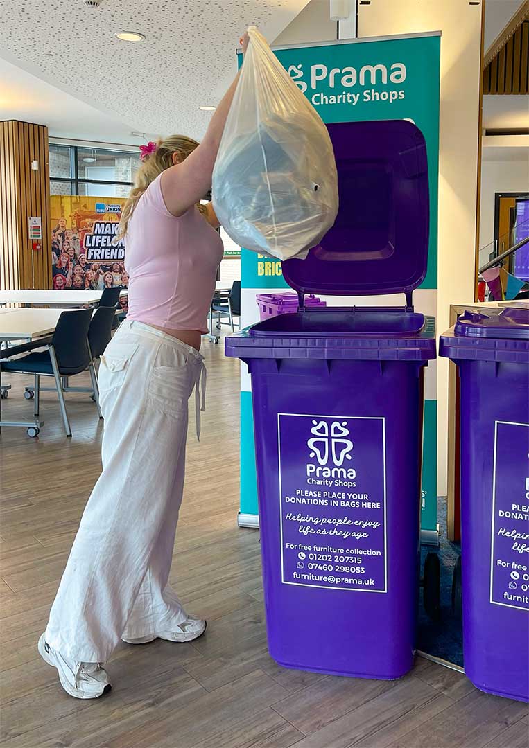 Use any of the temporary purple Prama Charity Shop donation bins on campus, where you can donate your unwanted