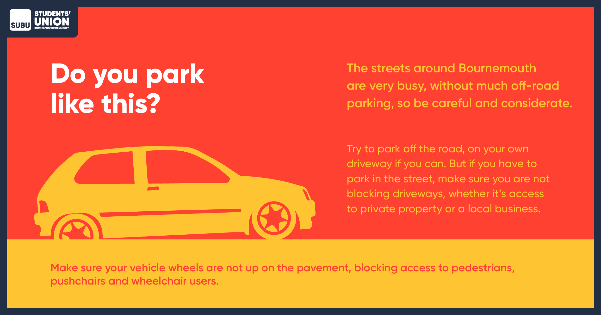 Make sure your vehicle wheels are not up on the pavement, blocking access to pedestrians, pushchairs and wheelchair users.