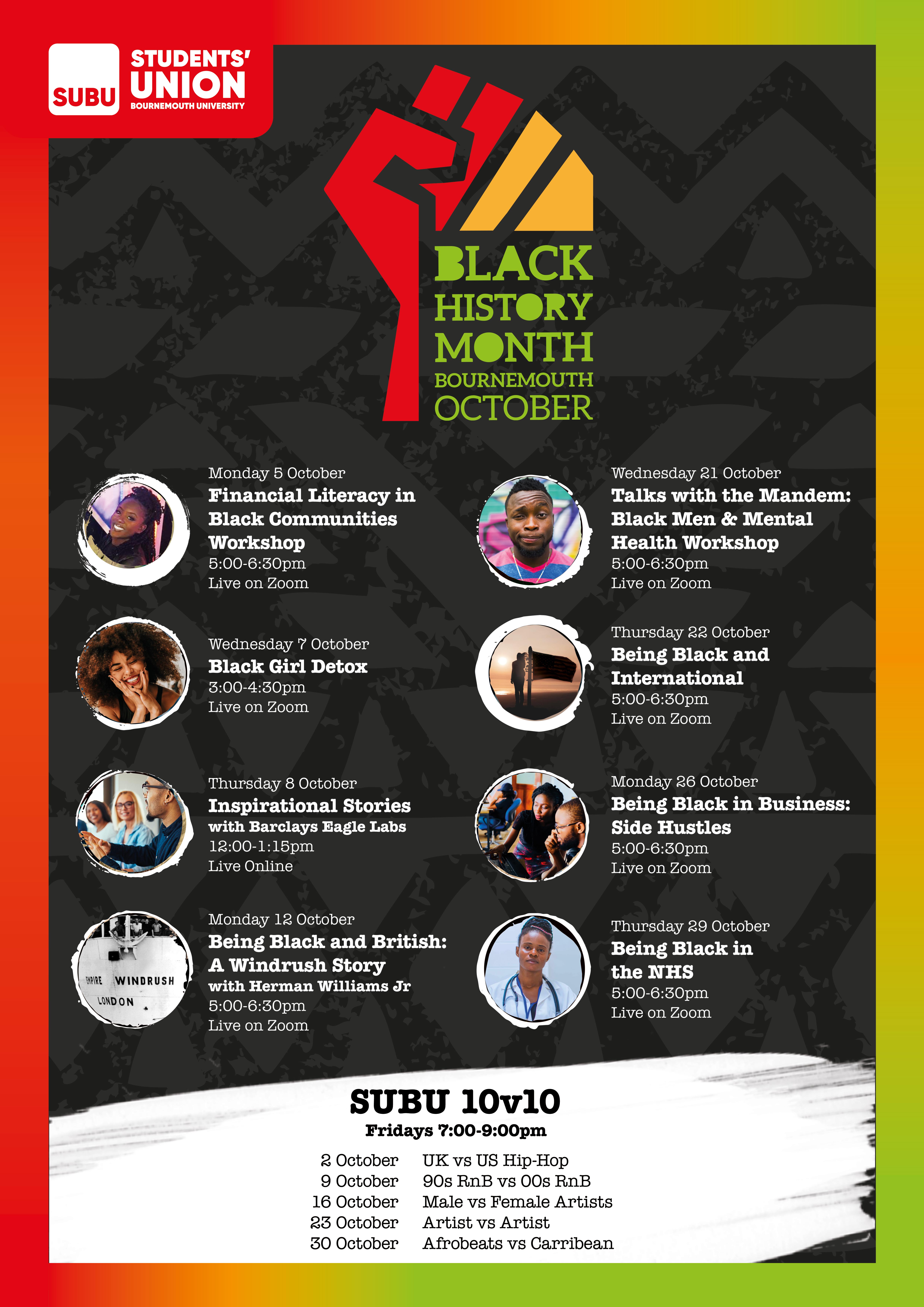 Over the years, SUBU have put together a variety of events to inspire, support and educate during the month of October, and this year is no different. The events that we run during Black History Month exist to create safe spaces for BU's Black community, and to educate others on the inequalities that have existed through history.
